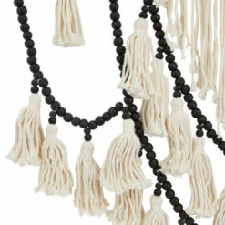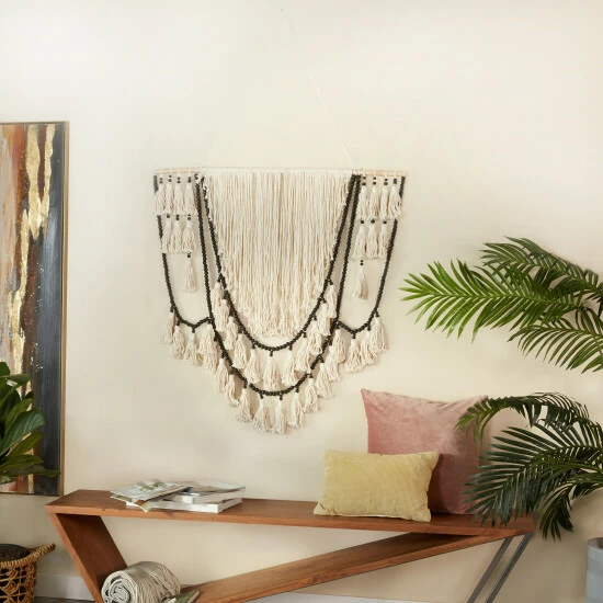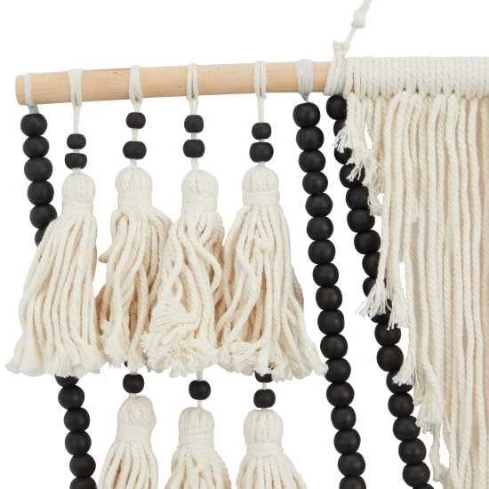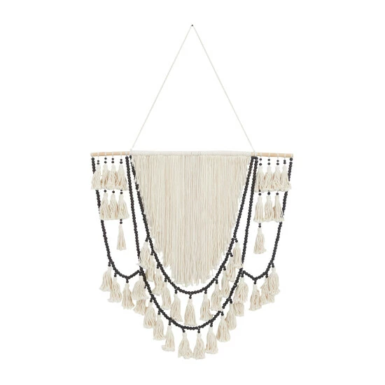 - A marriage of macrame pattern tassels and orb beads embellish this hanging wall decor for a calm natural look