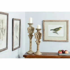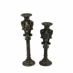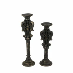 Add this black/brown candle holder set to your mantel, or use it to stylize a bedroom or entryway. Delight your guests and make any occasion extra special by adding a lighted or flameless candle to this candle holder centerpiece. Made with a sturdy base, it is perfect for creating an elegant atmosphere at your table top or mantel. This decorative candle holder set will hold two pillar candles. This item comes shipped in one carton. Suitable for indoor use. This set includes two wood candle holders. Vintage inspired.